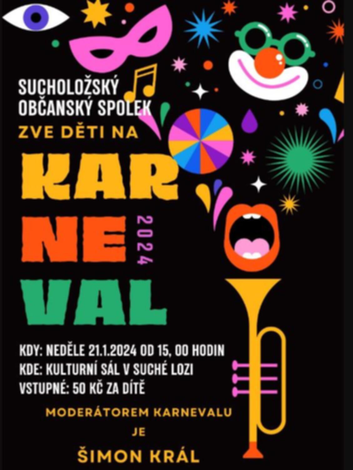 Sucholožský občanský spolek zve děti na "KARNEVAL 2024", který se koná v neděli 21. 1. 2024 od 15 hod v kulturním sále v Suché Lozi.