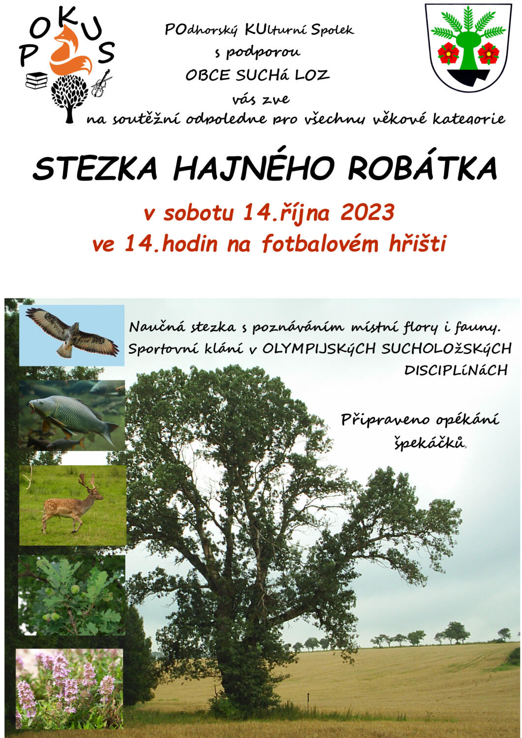 POKUS (POdhorský KUlturní Spolek) Vás zve na soutěžní odpoledne pro všechny věkové kategorie "Stezka hajného Robátka", které se koná tuto sobotu 14. října 2023 ve 14 hod na fotbalovém hřišti.