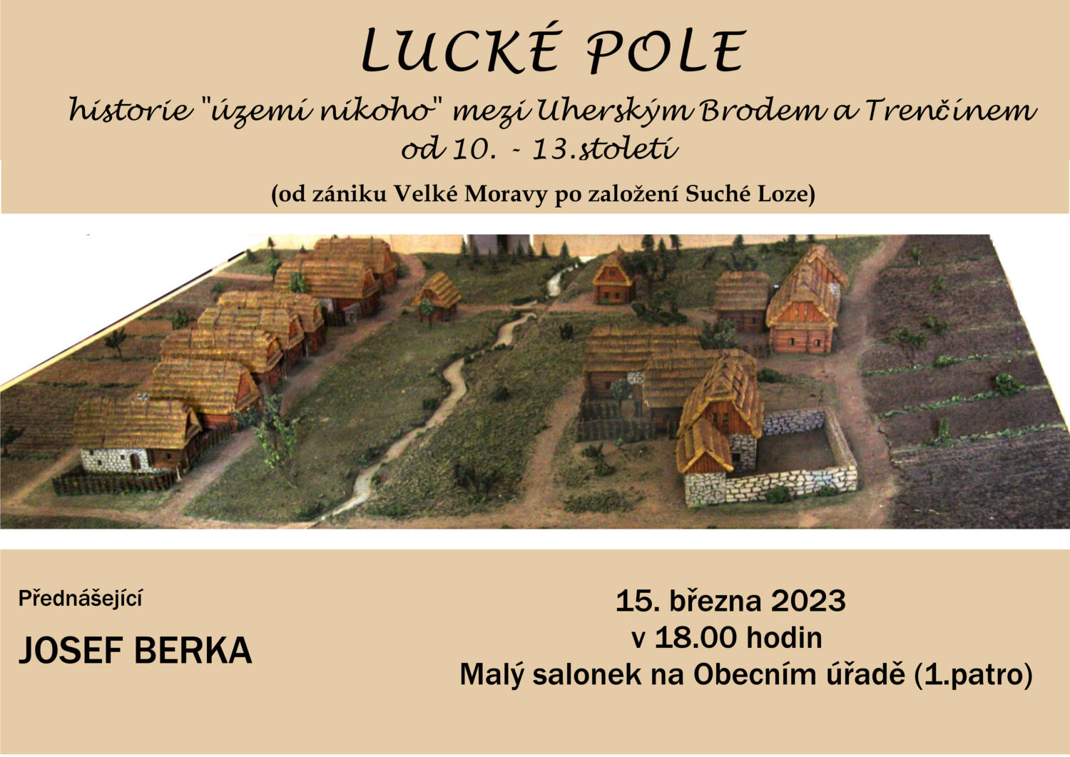 Přednáška pojednává o území mezi Uherským Brodem a Trenčínem od 10. - 13. století - období od zániku Velké Moravy až po založení Suché Loze. Přednášející je Bc. Josef Berka.